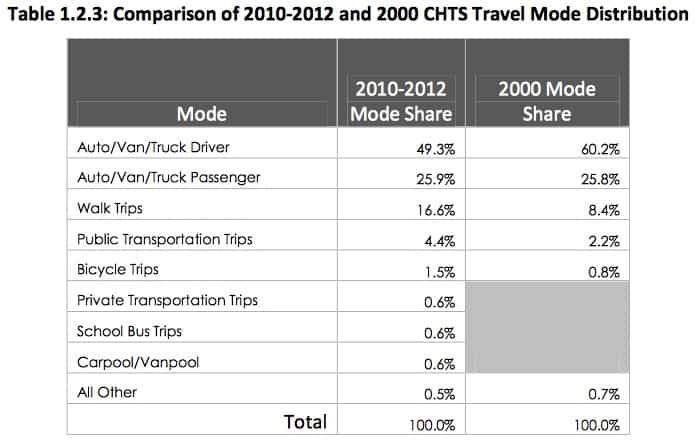The table below from the latest CHTS shows the exact breakdown of travel mode distribution, and how it compares to the 2000 survey:
